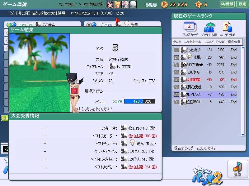 えー。終わってみて何がすごいかといいますと、光風さんが輝いていましたね。さすが、名前に電気がついているだけはあります( Wω・`)あれだけのパンヤ ポイント欲しいっすね。いつか・・・いつの日か。。