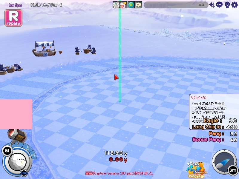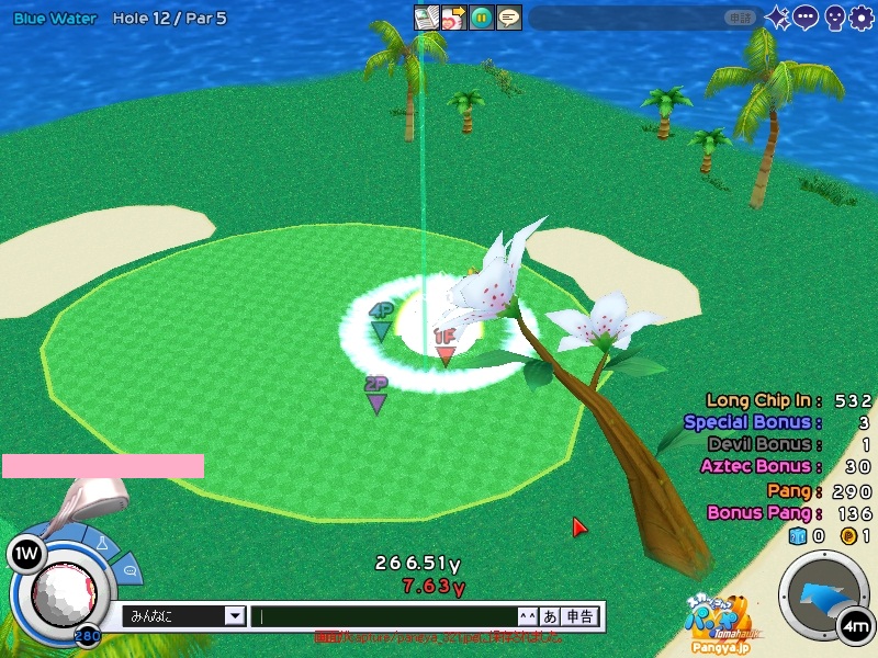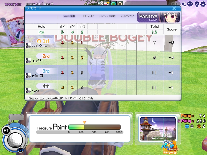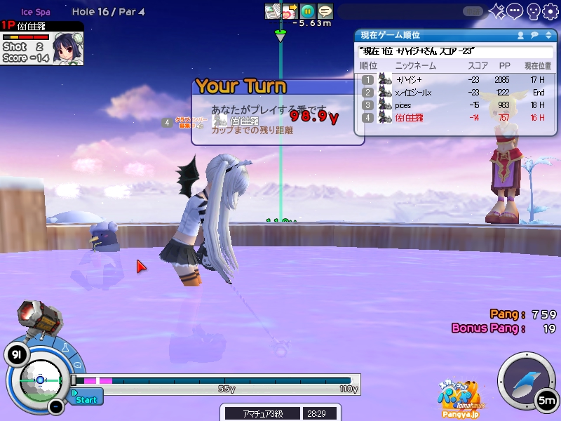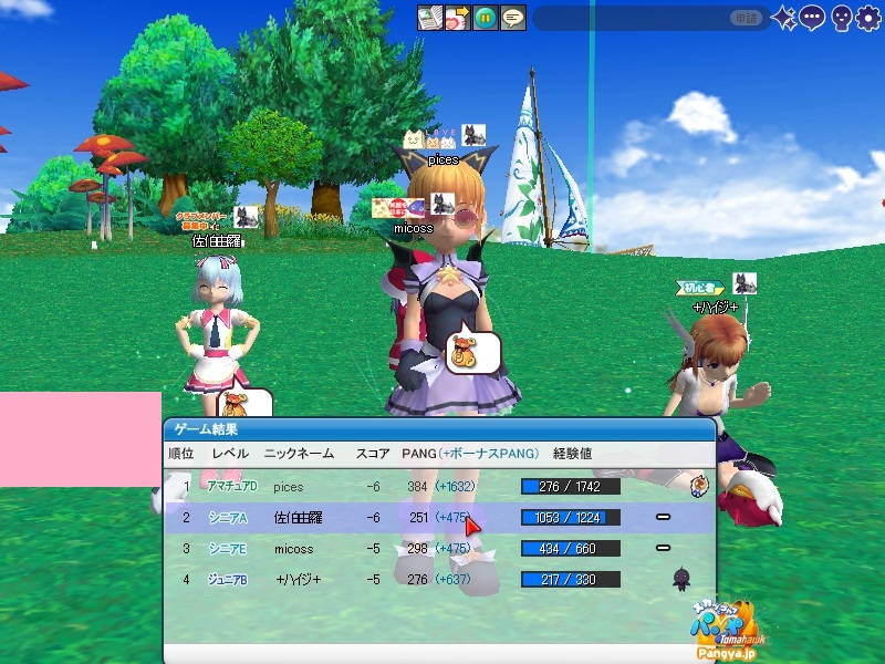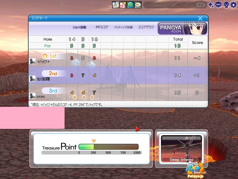 今回拉致参加してくれたメンバーはこの三人 ネタを大事に!でおなじみのpicesさん いつでも本気!がモットーのノイエジールさん 心にいつもMっ気を!で有名なハイジさん 古株のpices・由羅組と新人二名で大会と対戦を行いました(*Wω´-) しかし本当に数年ぶりとも言える交流戦(´・ω:;.:... ちょっと本気を出して書いていこうと思います!え?今まで本気で書いてなかったのかって?誰よ。そういうことを言うのわ(’-’*)マスターが退会させちゃうぞ? まずは大会でワイワイやろうということで、コースはネタが転がっているアイスへ。 ここの名物は温泉。そして絶景が広がる山々!((´∀`*))皆さんもぜひ休暇を堪能しにいってみてくださいw 滞りなく進む大会。OBやパンミはマスターの特殊能力なので消せません(*ノωノ) え?いい温泉がある?効能はパンミ病?ぜひいってみたいですね! はい。いってきました。ペンギンさんがかわいかったです(’-’*) ?えーっとリスナーからFAX?はいはい。面倒だわね(Wω・`) 痛い!マイクでたたくのは反則! えーっと、リスナーからFAX?えぇ!お読みいたしましょう!なになに、そこは温泉じゃなくてただの毒の沼です。 まじかぁ(Wω・`)おいしく飲んじゃったよ。 ん?picesさんも飲んだって?18Hでトマホークが水に沈んだ?それはきっと燃え盛る玉を消したかったのね!なんてすばらしいpicesさん(∀ ̄*) そういえばテレビで秘境!山の上!って旅番組がやってましたね。picesさんが行ってる?じゃお邪魔しませんとねヾ(-`ДW。)ノダ-!!!!w はい。来ましたドン。 高いねー!これは絶景!すばらしい!こういう所をめぐれるのがパンヤの醍醐味!(@・`Д・)bそして大会の結果がこちら! 古株二人が惨敗orz優勝は誰?ハイジさん?Mっ気がある人なのに優勝するなんてすばらしいね!出たがりなのね!きっと。 二位につけたのはノイエジールさん。通称ノイエ。 うちのガンマンを差し置いてベスピをとっちゃう忍者の方((´∀`*)) 大会をしてみて思ったこと。その一!(@・`Д・)b老兵は去るのみ!その二!(@・`Д・)b威厳ってなぁに? ここで、picesさんの案で「ネタなら対戦じゃね?ネタを大事に!」という名言の元対戦へ移行w そうです。白黒猫の交流会は意見尊重!柔軟に!そして何より適当に!|彡サッ! 対戦でまず目立ったのはpicesさんw対戦で同じ部屋にいるのに発言がずっとクラブあてにwww 部屋にいるので、みんなにの方がいいのですwなぜって?(@・`Д・)bクラブにだと、対戦してないメンバー全員に送信されちゃうから、参加してない人は頭に?が浮かぶの! ま、ほかのメンバーなんて 面白いからしばらく放置してましたw('∀'*) 対戦では、皆さん普通にプレイ。砂に入ったりラフに入ったりなんてしてませんよ?えぇ本当に(´・ω:;.:...この目を見て チャットでは適当に言っているマスターですが実は結構マジ(★´ノェ`)コチョーリ そんな私の事をずっと見ていた方がおりました。 「こいつ。裏でまじめにやってるくせに、ろくでもねぇプレイするな。おしいっちょびびらせてやるか!」 はい。°+.°(´っω・。′)°+. びびりました。それはもうほかのメンバー全員w今年の新人はいいのが入りましたねw将来安泰のクラブです(’-’*) 私もここでまねして、かっこよくきめれば(*Wω´-)。○ほわんほわん(想像) 「おぉ!さすがマスターHIOで合わせるなんてプロですね!」 「やっぱりマスターはすごいね。普段適当にやってるくせに実力は持っているね」 よしこれでいこう(*Wω´-) はい。想像終了!とばかりに打ちました!それはもう天空に舞い上がる龍のような玉を!ヽ('Д'*)ノ 龍は霧の向こうに消えていきました(ノω`)さすが龍。かっこいいわ! はい(Wω・`)ごめんなさいパンミです。谷底って玉がいっぱい転がってるのね。あれ?これ私も玉だ。あれ?これも。これもだ。 燃やして来ました┳┳~旦( ̄*)こんな過去の遺物は封印するに越したことはない! 結構本気で狙ったんですがパンミでは仕方がないです。picesさんもわれ続けとばかりに本気モードに突入!サイレントもつかって。確実にHIOをとりにきました! さすが!!!! え?カップってそんな下にあったっけって?あるのよ!あとこに打ち込むとHIOに! スパイクとコブラ。コマンド間違えたw だそうよ(★´ノェ`)コチョーリ スコアを見ると、新人二人は安定しております。さすが!の一言につきる!我ながらいいメンバーを見つけ出したものです((´∀`*))ケラ このまま調子に乗って・・・?え?古株二人は言わないのかって? そんなの説明しなくても見りゃわかるでしょ?(´っェ・`)クス 対戦二回目は、ネタの宝庫。ディープインフェルノ!ここはなんと言ってもパンミ=ニヤニヤのコースヾ(-`ДW。)ノダ-!!!!w それで、行った3Hがすべてパー5orz悪意を感じますね。むしろネタが足りないんじゃない?という神様のいじわる(Wω・`)ここまで来ると 何か面白いことが転がっていないのかと思って探していましたが、別段特に面白いことも転がっておりません(´・ω:;.:... 火山が噴火したくらいです。見事に噴火しましたね('∀'*) 下のほうで爆ぜているのは、漏れ出した
