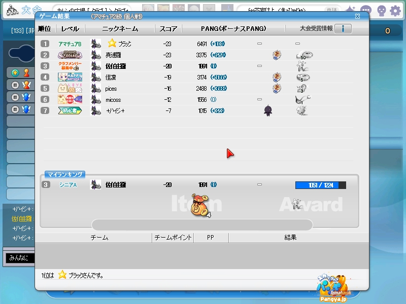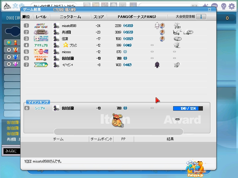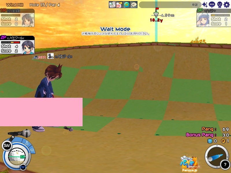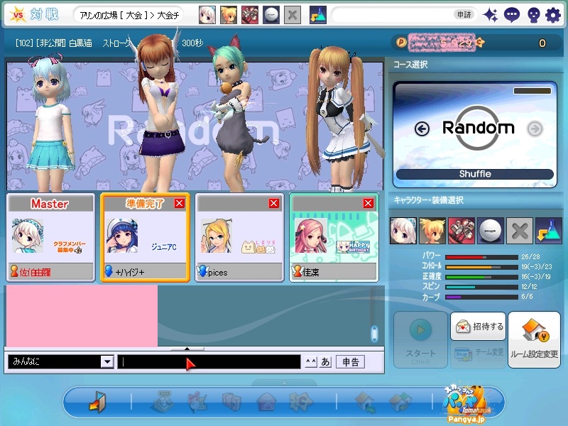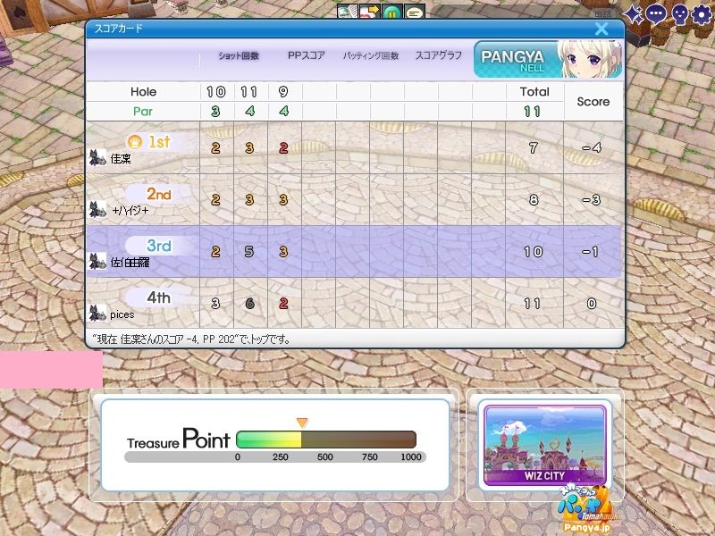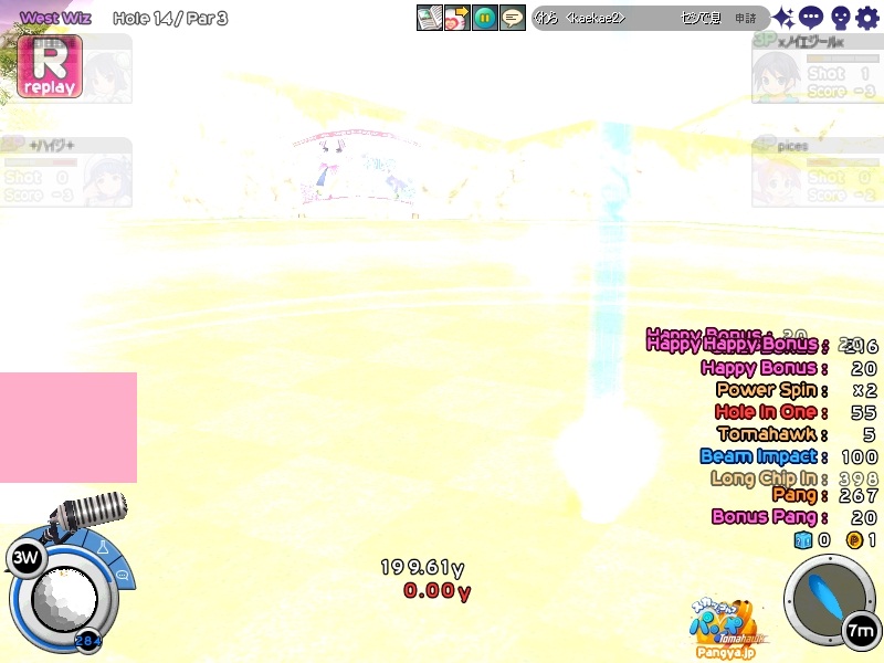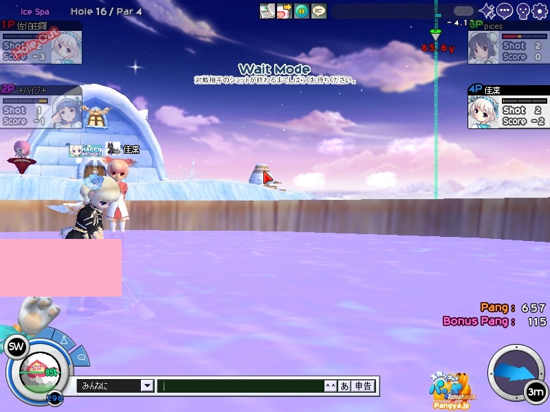 今回拉致参加してくれたメンバーはこの三人 ネタを大事に!でおなじみのpicesさん いつでも本気!がモットーのノイエジールさん 心にいつもMっ気を!で有名なハイジさん 古株のpices・由羅組と新人二名で大会と対戦を行いました(*Wω´-) しかし本当に数年ぶりとも言える交流戦(´・ω:;.:... ちょっと本気を出して書いていこうと思います!え?今まで本気で書いてなかったのかって?誰よ。そういうことを言うのわ(’-’*)マスターが退会させちゃうぞ? まずは大会でワイワイやろうということで、コースはネタが転がっているアイスへ。 ここの名物は温泉。そして絶景が広がる山々!((´∀`*))皆さんもぜひ休暇を堪能しにいってみてくださいw 滞りなく進む大会。OBやパンミはマスターの特殊能力なので消せません(*ノωノ) え?いい温泉がある?効能はパンミ病?ぜひいってみたいですね! はい。いってきました。ペンギンさんがかわいかったです(’-’*) ?えーっとリスナーからFAX?はいはい。面倒だわね(Wω・`) 痛い!マイクでたたくのは反則! えーっと、リスナーからFAX?えぇ!お読みいたしましょう!なになに、そこは温泉じゃなくてただの毒の沼です。 まじかぁ(Wω・`)おいしく飲んじゃったよ。 ん?picesさんも飲んだって?18Hでトマホークが水に沈んだ?それはきっと燃え盛る玉を消したかったのね!なんてすばらしいpicesさん(∀ ̄*) そういえばテレビで秘境!山の上!って旅番組がやってましたね。picesさんが行ってる?じゃお邪魔しませんとねヾ(-`ДW。)ノダ-!!!!w はい。来ましたドン。 高いねー!これは絶景!すばらしい!こういう所をめぐれるのがパンヤの醍醐味!(@・`Д・)bそして大会の結果がこちら! 古株二人が惨敗orz優勝は誰?ハイジさん?Mっ気がある人なのに優勝するなんてすばらしいね!出たがりなのね!きっと。 二位につけたのはノイエジールさん。通称ノイエ。 うちのガンマンを差し置いてベスピをとっちゃう忍者の方((´∀`*)) 大会をしてみて思ったこと。その一!(@・`Д・)b老兵は去るのみ!その二!(@・`Д・)b威厳ってなぁに? ここで、picesさんの案で「ネタなら対戦じゃね?ネタを大事に!」という名言の元対戦へ移行w そうです。白黒猫の交流会は意見尊重!柔軟に!そして何より適当に!|彡サッ! 対戦でまず目立ったのはpicesさんw対戦で同じ部屋にいるのに発言がずっとクラブあてにwww 部屋にいるので、みんなにの方がいいのですwなぜって?(@・`Д・)bクラブにだと、対戦してないメンバー全員に送信されちゃうから、参加してない人は頭に?が浮かぶの! ま、ほかのメンバーなんて 面白いからしばらく放置してましたw('∀'*) 対戦では、皆さん普通にプレイ。砂に入ったりラフに入ったりなんてしてませんよ?えぇ本当に(´・ω:;.:...この目を見て チャットでは適当に言っているマスターですが実は結構マジ(★´ノェ`)コチョーリ そんな私の事をずっと見ていた方がおりました。 「こいつ。裏でまじめにやってるくせに、ろくでもねぇプレイするな。おしいっちょびびらせてやるか!」 はい。°+.°(´っω・。′)°+. びびりました。それはもうほかのメンバー全員w今年の新人はいいのが入りましたねw将来安泰のクラブです(’-’*) 私もここでまねして、かっこよくきめれば(*Wω´-)。○ほわんほわん(想像) 「おぉ!さすがマスターHIOで合わせるなんてプロですね!」 「やっぱりマスターはすごいね。普段適当にやってるくせに実力は持っているね」 よしこれでいこう(*Wω´-) はい。想像終了!とばかりに打ちました!それはもう天空に舞い上がる龍のような玉を!ヽ('Д'*)ノ 龍は霧の向こうに消えていきました(ノω`)さすが龍。かっこいいわ! はい(Wω・`)ごめんなさいパンミです。谷底って玉がいっぱい転がってるのね。あれ?これ私も玉だ。あれ?これも。これもだ。 燃やして来ました┳┳~旦( ̄*)こんな過去の遺物は封印するに越したことはない! 結構本気で狙ったんですがパンミでは仕方がないです。picesさんもわれ続けとばかりに本気モードに突入!サイレントもつかって。確実にHIOをとりにきました! さすが!!!! え?カップってそんな下にあったっけって?あるのよ!あとこに打ち込むとHIOに! スパイクとコブラ。コマンド間違えたw だそうよ(★´ノェ`)コチョーリ スコアを見ると、新人二人は安定しております。さすが!の一言につきる!我ながらいいメンバーを見つけ出したものです((´∀`*))ケラ このまま調子に乗って・・・?え?古株二人は言わないのかって? そんなの説明しなくても見りゃわかるでしょ?(´っェ・`)クス 対戦二回目は、ネタの宝庫。ディープインフェルノ!ここはなんと言ってもパンミ=ニヤニヤのコースヾ(-`ДW。)ノダ-!!!!w それで、行った3Hがすべてパー5orz悪意を感じますね。むしろネタが足りないんじゃない?という神様のいじわる(Wω・`)ここまで来ると 何か面白いことが転がっていないのかと思って探していましたが、別段特に面白いことも転がっておりません(´・ω:;.:... 火山が噴火したくらいです。見事に噴火しましたね('∀'*) 下のほうで爆ぜているのは、漏れ出した
