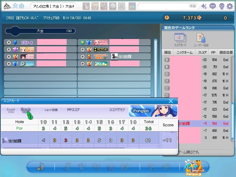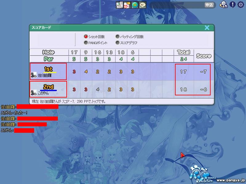 PCの調子が悪い今日この頃。特に何をするわけでもなくネットにつなぎテラテラと巡回をしておりました(ノ∀`) でもって、メッセンジャーに暇そうにしている1人を発見し、拘束。 由羅「ねー。暇なの?」 相手「う、うん。誰もかまってくれないからさ・゚・(ノД`)・゚・」 由羅「マスターとしてメンバーをかまわない訳にはいかないわね。パンヤでもする?」 相手「おー!ありがとうございます・゚・(ノД`)・゚・ここ二週間誰にも相手にされず寂しかったんです!どこまでもついて行きます!」 と言う事で、相手(このやん=また出ました。自称妖怪)と2人でパンヤへ。時間は深夜の一時頃ヽ(’Д’*)ノ 久々だからと言って手加減するわけにも参りません!全身全霊を持って相手になりました!えぇ。初めての手加減なしってやつっすよ! (*W 3´-)b えー。この映像はニセモノです。この時は入りました。えぇえぇ。ホールインワンっす。入っていたんです!ヽ(’Д’*)ノこれ以上詮索はするな!何も言うな!言うんじゃない! このやんも負けじとホールインワンを狙いました( Wω・`) この画像は本物です。惜しいですね。非情に惜しい。彼はこの後の人生も惜しい人生を歩むのでしょう( ★´ノェ`)コチョーリ 終わってみれば、まぁまぁの結果w ま勝てば官軍!ヽ(’Д’*)ノ負けたやつが文句を言う資格は何もない! ってな訳で、そんなやつには…これ↓ バナナっす。山にでも帰りなさい妖怪。 と言うわけで久々のパンヤ実況は終了!次回は正義のヒーローまさかのピンチ!!謎の美少女らーゆ登場!おたのしみに!