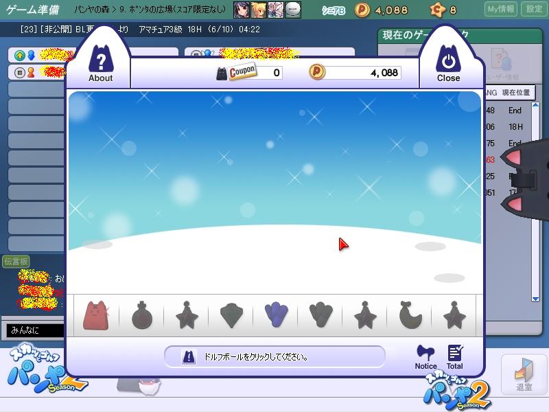 09/20/23:56 黒ポンタを探して・・・え~。パンヤをやっている人なら一度は耳にした事がある「白黒猫の夢」(チガ。 「黒ポンタ」ですよ!ヽ(’Д’*)ノ 黒ポンタ!えぇ。あれをゲッチュする為に大会をやっているような物。。。 今日もせっせとPP(パンヤの世界でのお金)を稼いで、黒ポンガチャガチャにつぎ込んでorz 今日は初めてお目にかかりました (*W 3´-)b