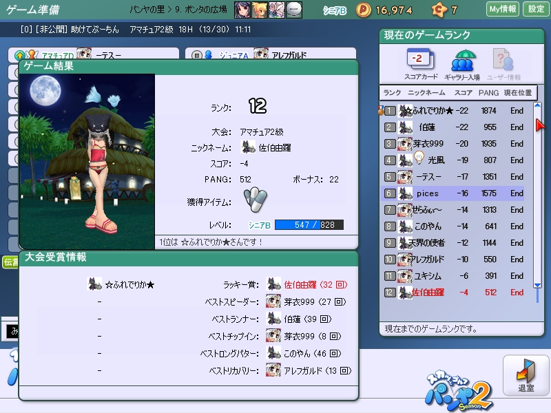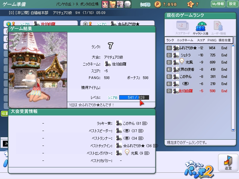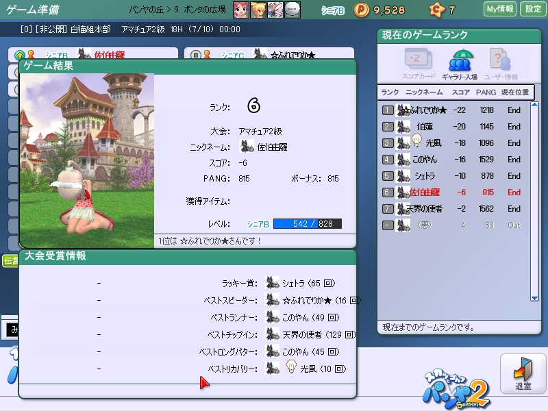 集まった六人でとりあえず、ICでも攻めようかと 勝ってネタにしようと、色々な思惑が入り交じる中プチ交流会はスタートしました。(ちなみにマスターはこの時日本酒が程よく満タンに入っており、良い感じに酔っ払いになってましたorz) メンバーが前半戦バーディーを着々ととるなか、マスターはパットが入らない入らない・゚・(ノД`)・゚・。3mのパットすら普通に外す始末。。もうバーンですよ!バーン!ヽ(’Д’*)ノキーボードクラッシャーになりましたね!ノートPCなのでメモリーがどっかに飛んでいきました(*ノωノ) 他の人達は、素晴らしくいつもの感じでプレーしているようで、私だけが取り残されていきました。 ちなみに、優勝候補だったサブマスターの伯さんは最後の最後でバグOBがあったらしく、優勝は「☆フレデリカ★」さんに決定(@・`д・)b